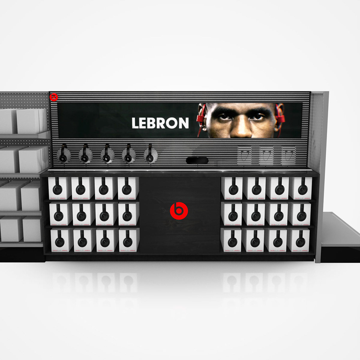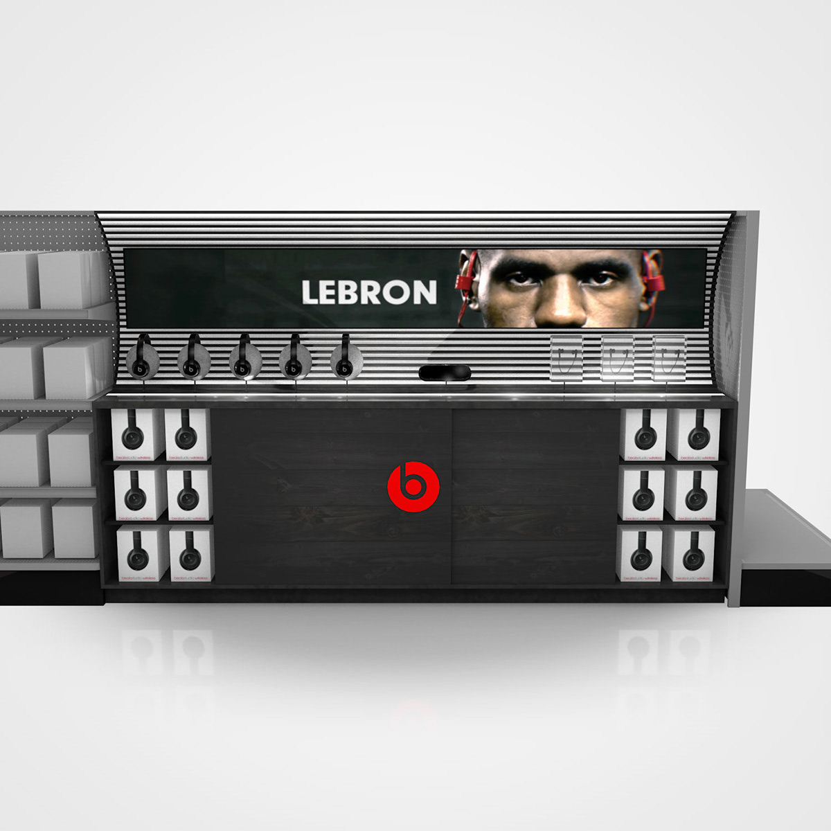 Point-of-purchase display design and visualization for Beats By Dre retail environments. Full 3D modeling, rendering, and branding integration using Cinema 4D.